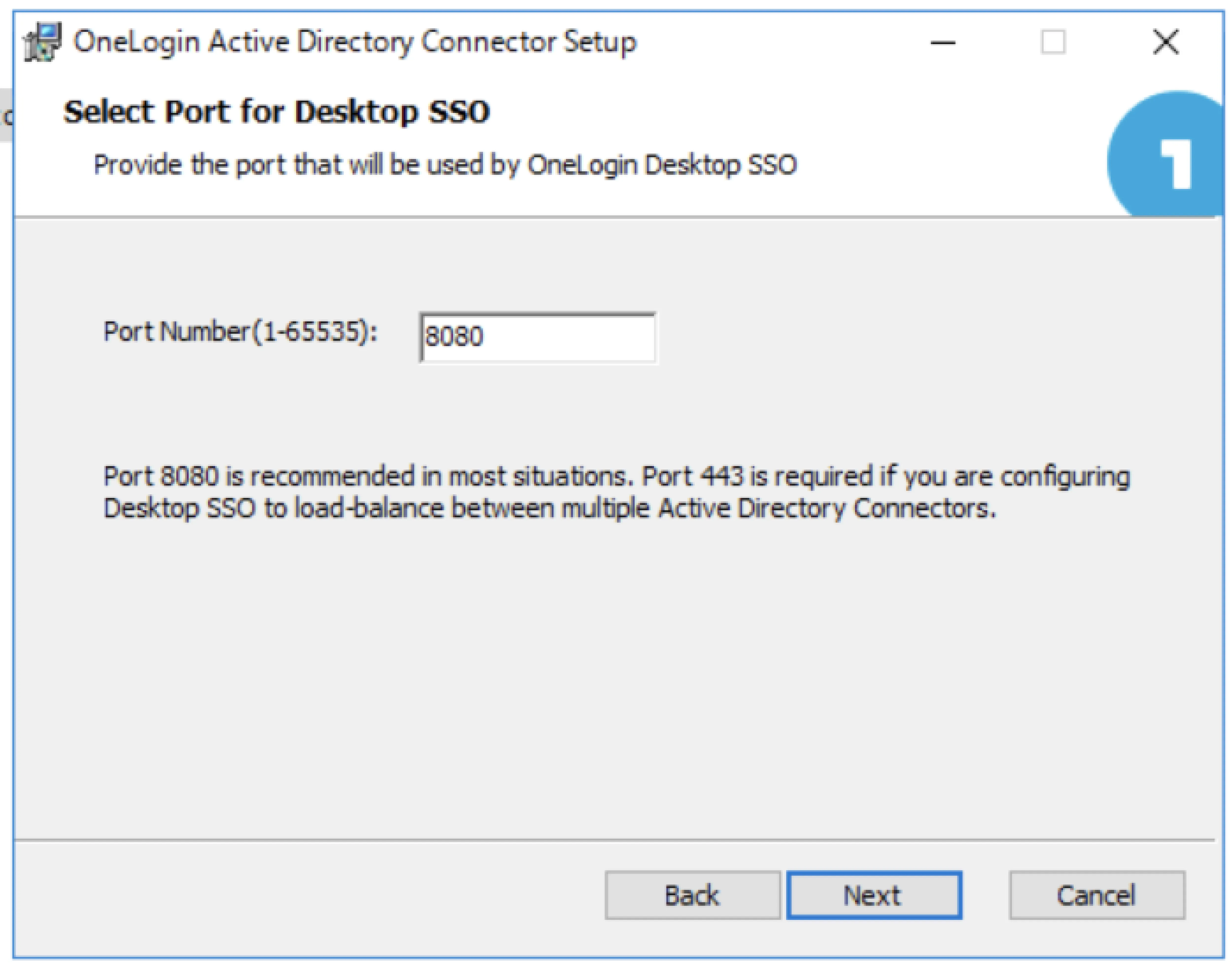 Windows Domain Authentication用ポート選択 Windows Domain Authenticationを利用する場合は、実際にドメイン参加デバイスから通信できるポートを選択してください。 利用しない場合は、一旦デフォルトの8080のまま [Next] をクリックします