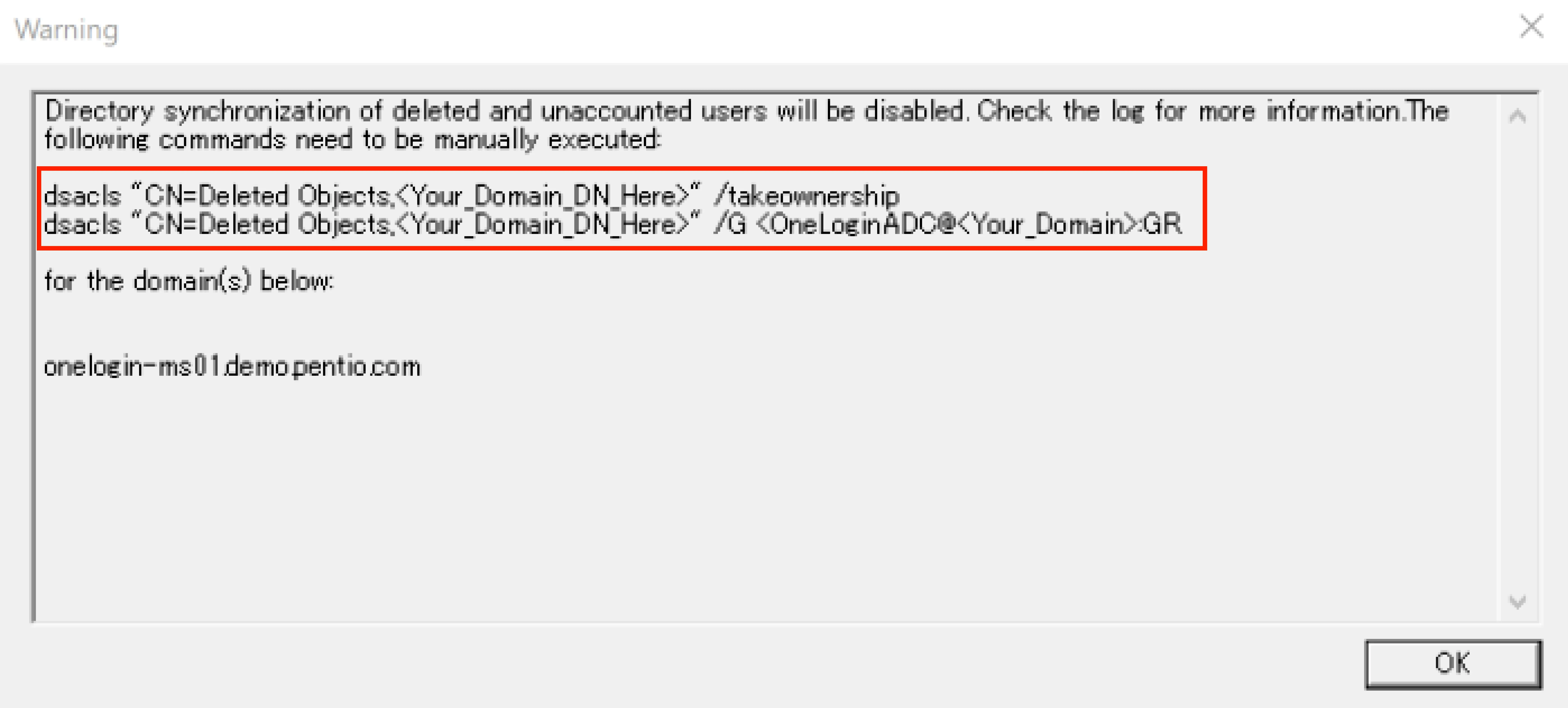下記画像のようなポップアップが表示されます。 AD上のユーザーが削除された時、「削除されたオブジェクト」が格納されたOUにOneLogin ADCがアクセスする必要があるため、左記画面が表示されたらコマンドをメモ帳にコピーしてください。 ドメイン名の部分3箇所を自社ドメインに修正し、PowerShellまたはコマンドプロンプトを管理者権限で開き実行します。
