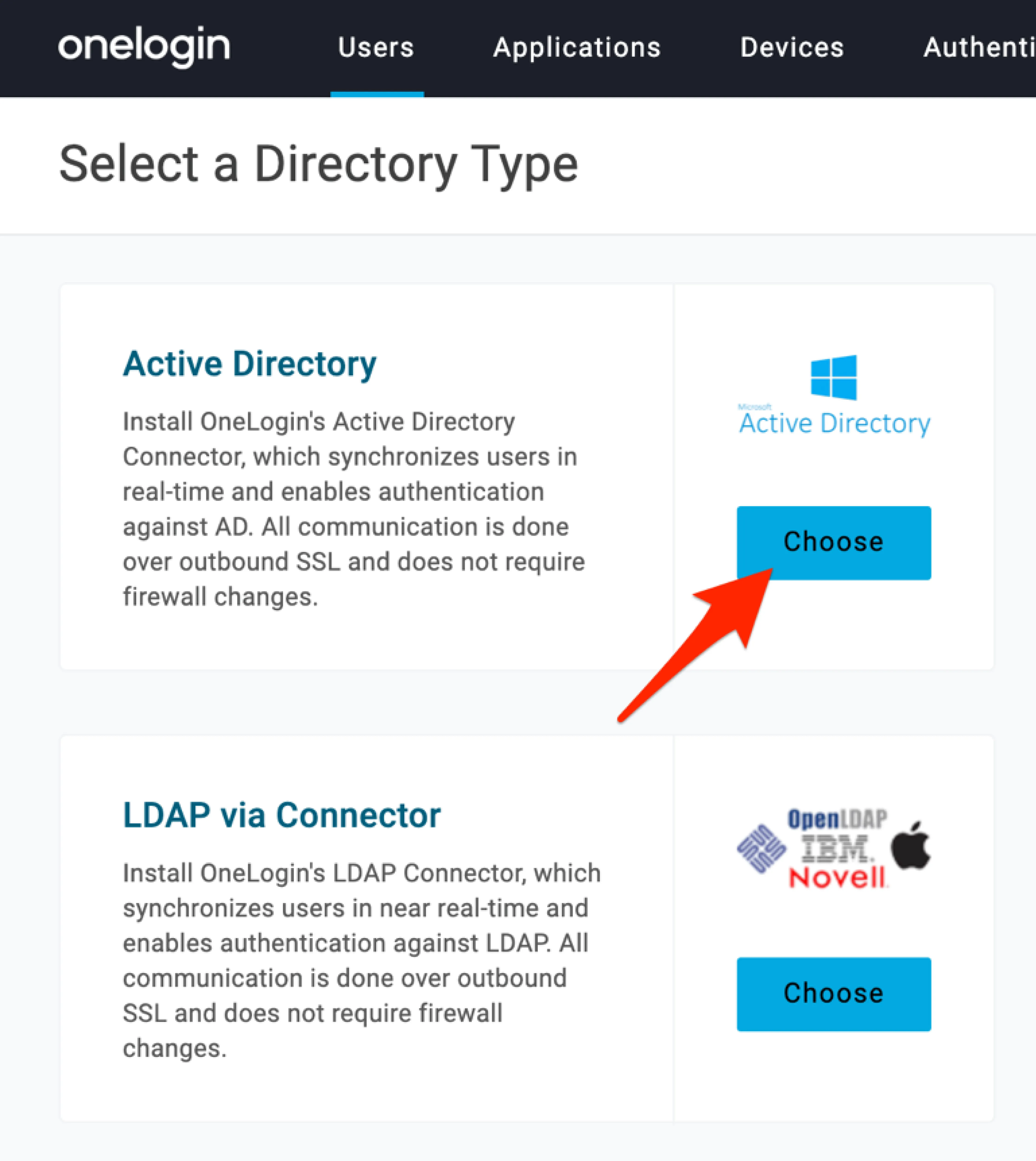 ディレクトリの種類を選択する画面が出てきますので、Active Directory の [Choose] をクリックします。