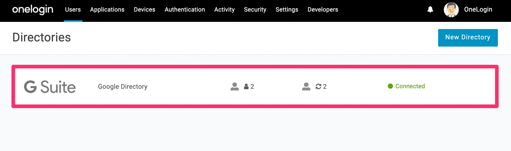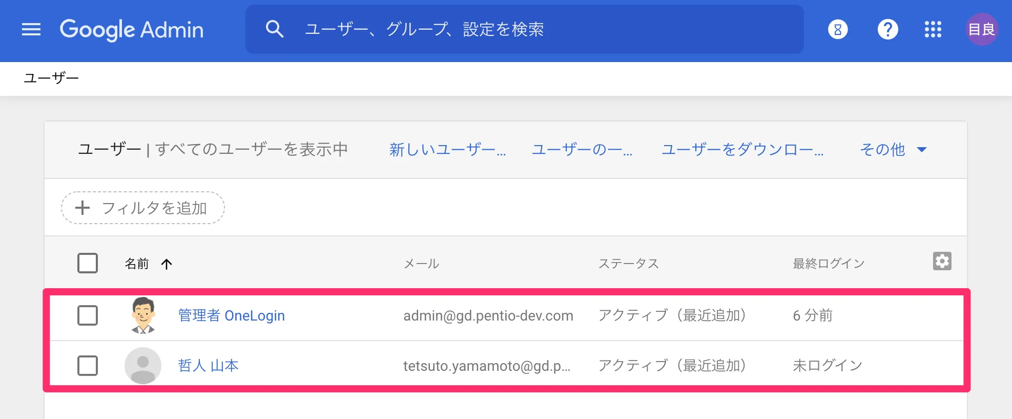 OneLoginとGoogle Directoryのディレクトリ連携ができているかを確認します。