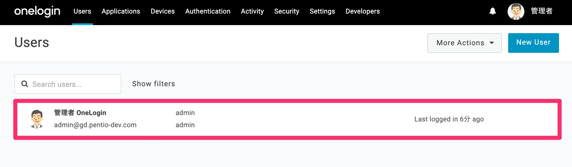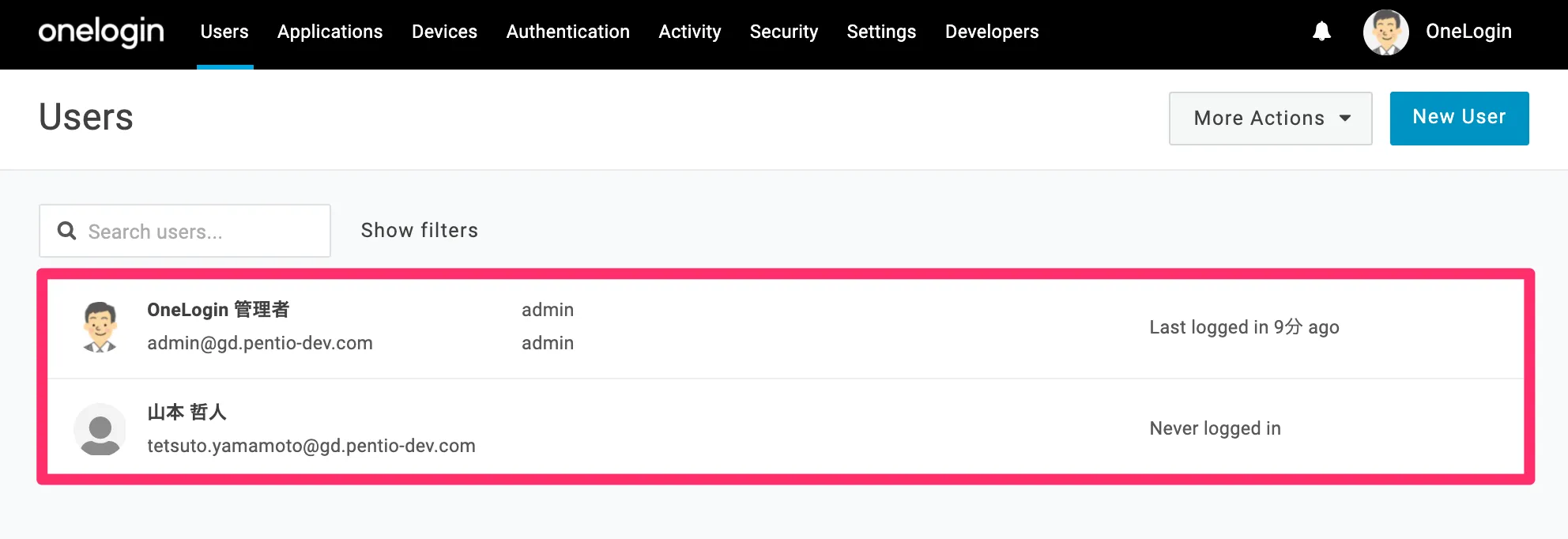 Google Directoryに登録されているユーザーが登録されていることを確認します *既にOneLoginとGoogle Directoryの両方に存在するユーザは連携を開始すると紐付きます *既にMappingルールの登録がある場合は、ユーザー作成と同時にRoleの割当などが実行されます