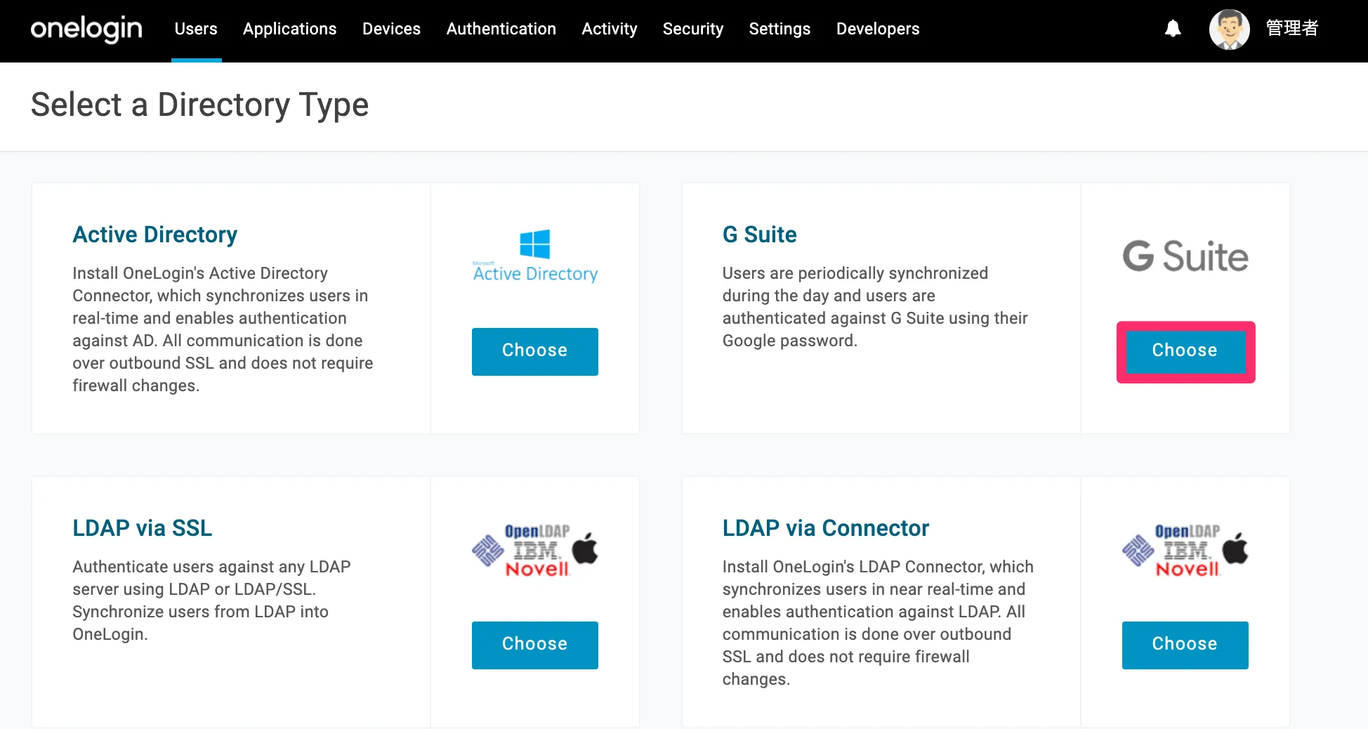 Select a Directory Type > G Suite(※)の[Choose]をクリックします