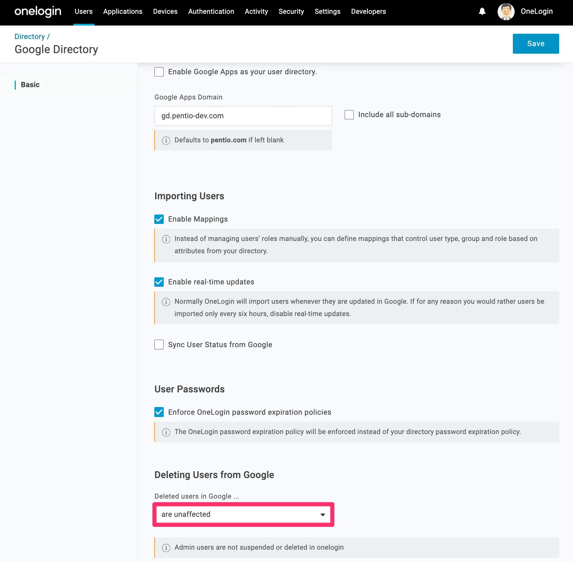 Deleting Users from Google > Deleted users in Google … においてGoogle Directory側でユーザーが削除されたときに、紐付いたOneLoginユーザーに適用する処理を選択できます ・are unaffected(何もしない) ・are suspended(無効化する) ・are deleted(削除する) *無効化または削除を推奨します