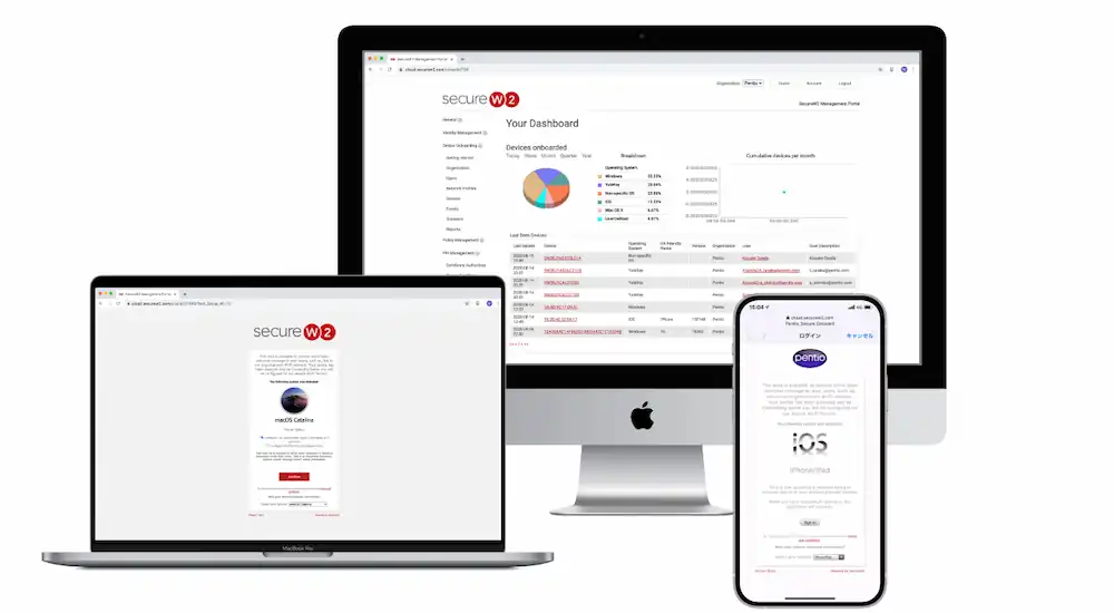 ペンティオでは、証明書発行サービスのSecureW2とIDaaSのOneLoginを組み合わせてご利用いただくことで、多くの企業様からご要望をいただく「 クラウドサービスへのアクセスを会社から支給された端末にだけ許可 」の実現を提案しております。MDMサービスを使うことで、SecureW2で作成した証明書をエンドユーザーに意識させることなく配布できます。この証明書をOneLoginへのログイン時に要求するようにすることで、会社支給の端末からだけのアクセスに制限することができます。