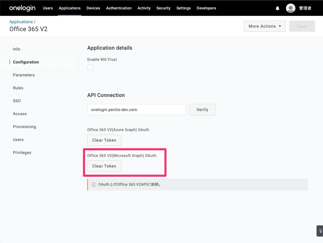 Configuration > API Connection に Office 365 のフェデレーションドメインを入力し、[Verify]をクリックします 例:onelogin.pentio-dev.com