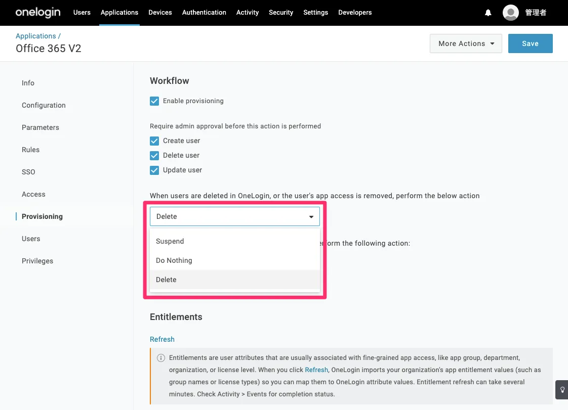 Provisioning > When users are deleted in OneLogin… で、OneLogin側でユーザーが削除もしくはロールから外された際の、Office 365側でのアカウントの動作を選択します