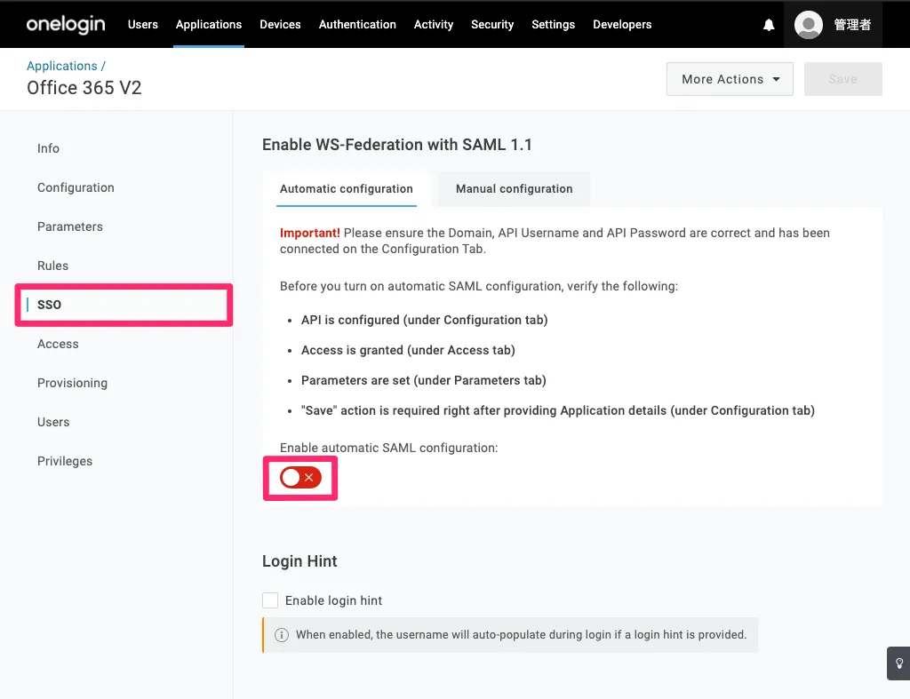 SSO > Enable automatic SAML configuration: という赤いスイッチをクリックします