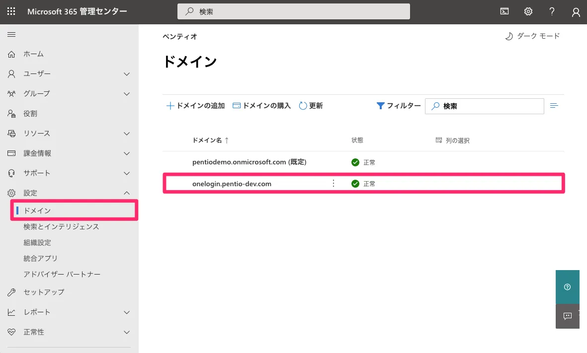 フェデレーションドメイン以外の他のドメインに全体管理者の権限を持つユーザーを少なくとも1つ用意してください(例: admin@pentiodemo.onmicrosoft.com )