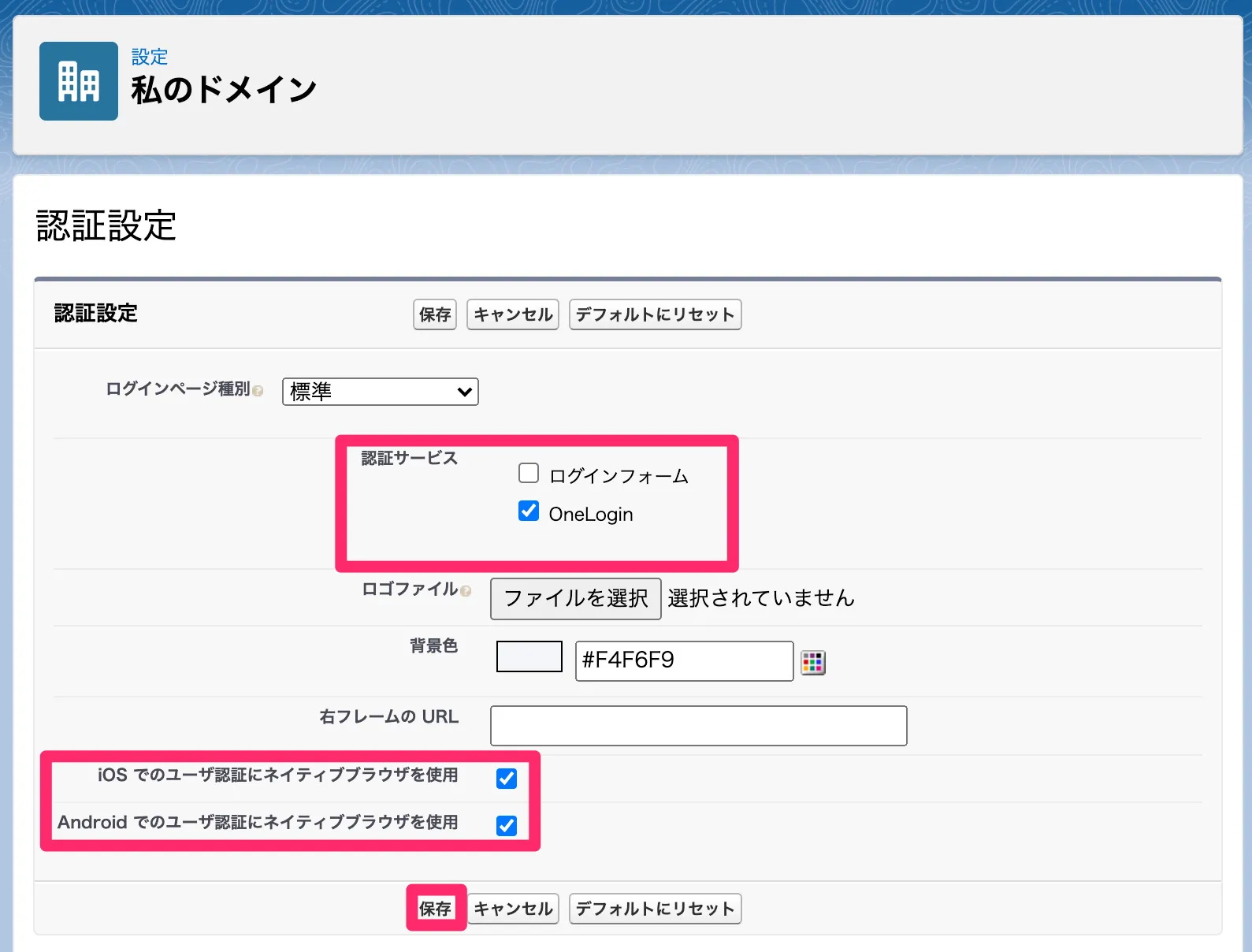 ・https://login.salesforce.com からのログインを防止 ・https://login.salesforce.com からの SOAP API ログインを防止 にチェックを入れ[保存]します。OneLoginのみからログインできるように、認証設定 > 認証サービス でログインフォームのチェックを外し、OneLoginにチェックを付けます。ブラウザがサポートする証明書認証やWebAuthnを用いるために、 ・iOSでのユーザ認証にネイティブブラウザを使用 ・Androidでのユーザ認証にネイティブブラウザを使用にチェックを付け、[保存]します。
