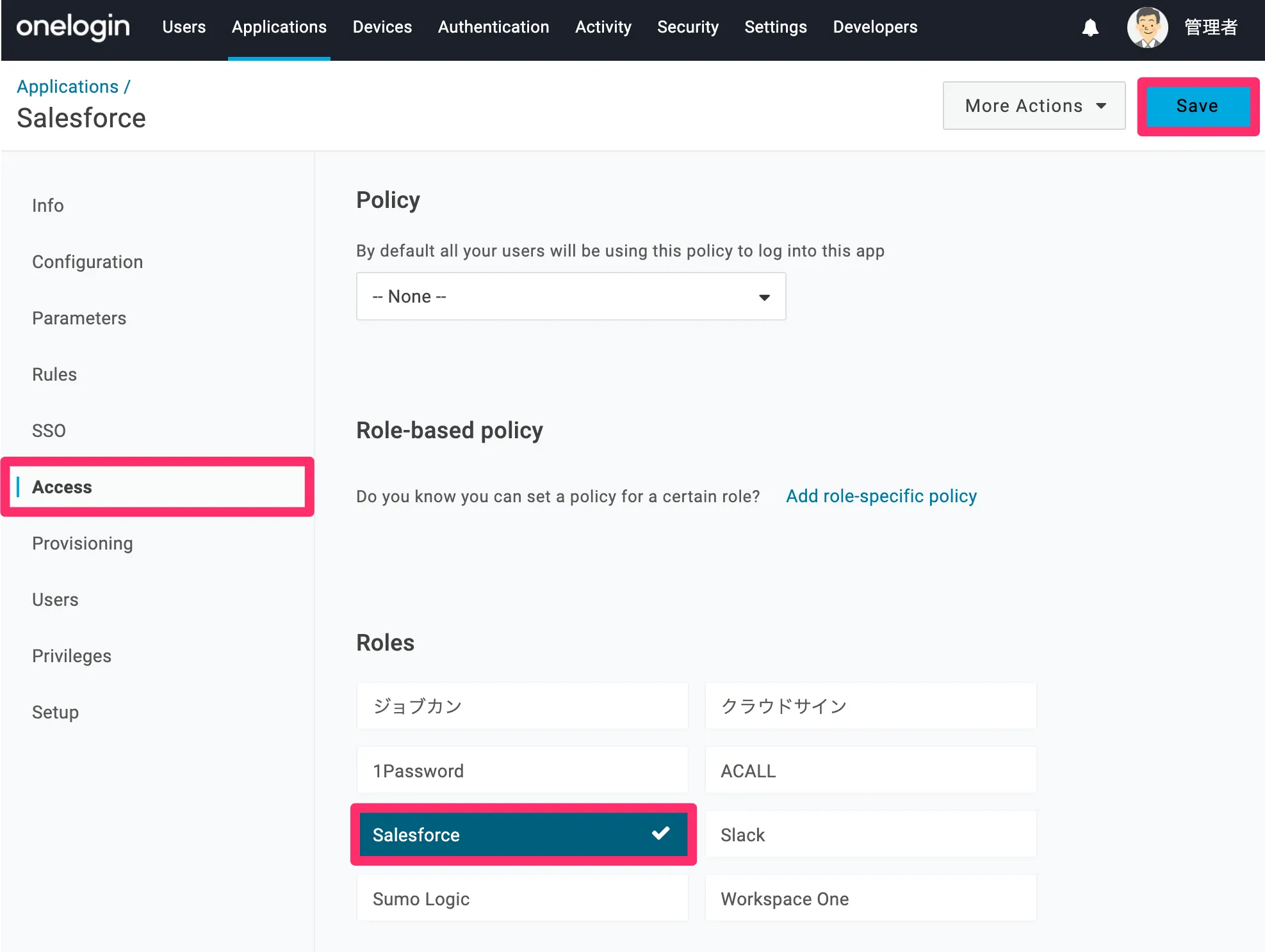 Access > RolesでSalesforceを割り当てるロールを選択し、[Save]します