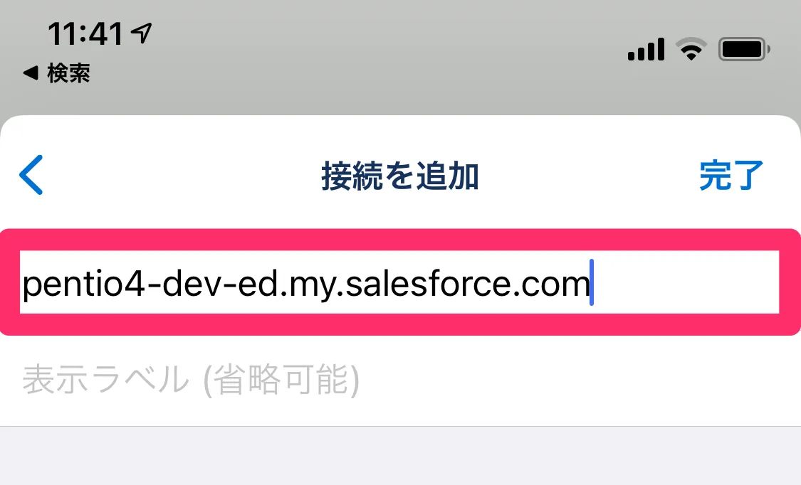 右上の [+] をタップし、1.SAML連携の設定の手順4のログインURLの「https://」を省いたものを入力します 例 : 手順4で入力したのが https://[subdomain].my.salesforce.com の場合は [subdomain].my.salesforce.com を入力します