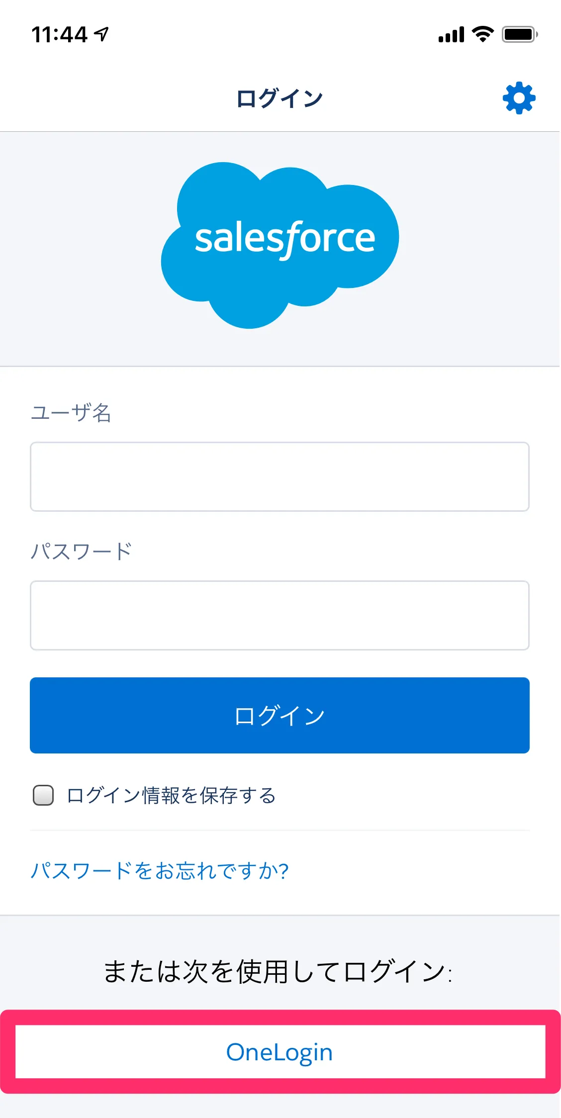 Salesforceモバイルアプリのログイン画面下部の[OneLogin]をタップするとOneLoginのログイン画面に遷移します。