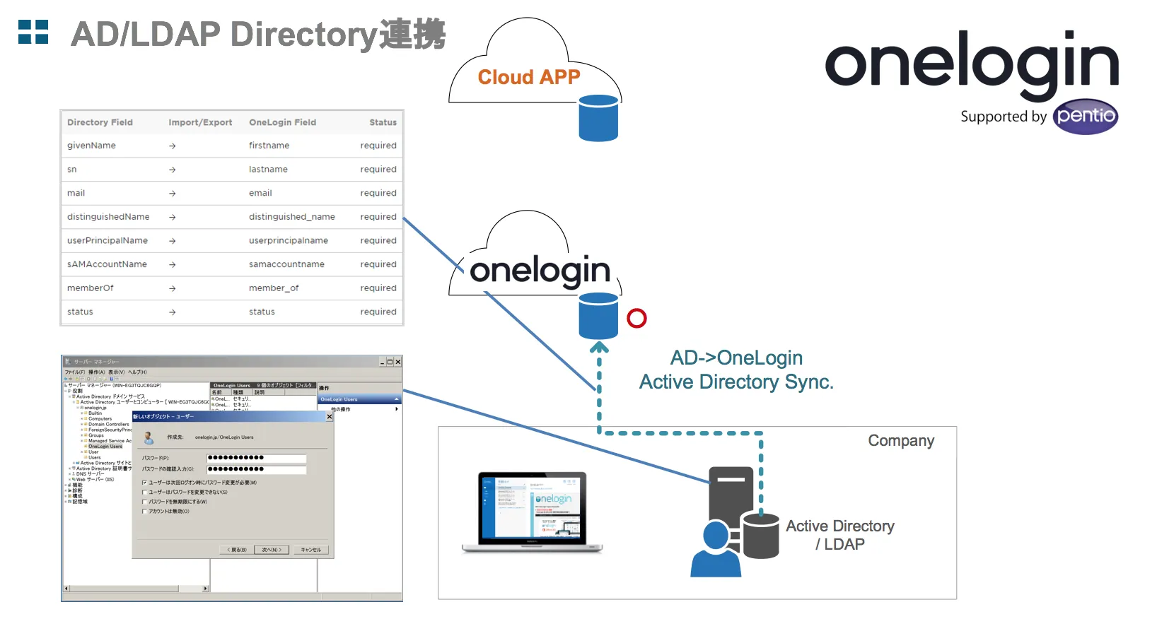 ところがOneLoginを試してみるとひと言で「超簡単です」。シンプルかつ簡単かつトラブルフリーです。何故か?OneLoginはActive Directoryサーバにエージェント等のインストールが実質ありません単体の実行プログラムのみです。あとのシステムは全部クラウド上です。自社システムとクラウドのあいだに中間又は変換サーバーはいりません。