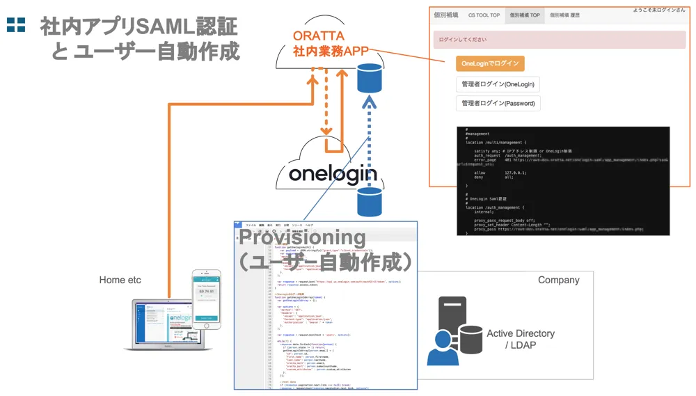 ※ORATTA様は(1)社内アプリをOneLogin SAML ToolKitを活用してSAML認証(2)社内アプリ利用者をOneLogin APIを活用してユーザー自動作成Provisioning のふたつを実現(編集部注)