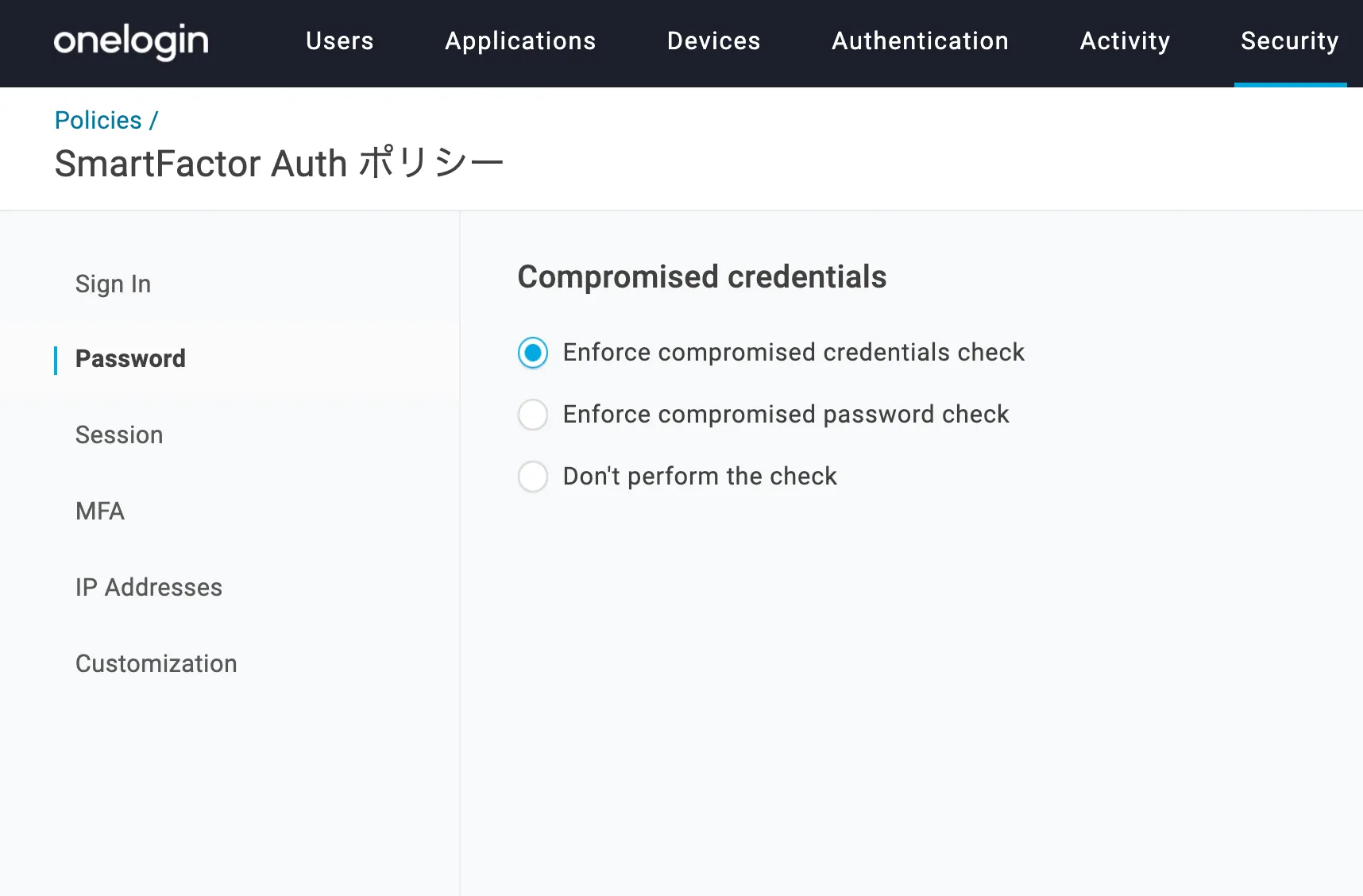 SmartCompromised Credentials Checkを設定すると、ユーザーがOneLoginのパスワードを設定する時に侵害されたパスワードを利用できなくします。 パスワードの最小長や複雑さといった従来のパスワード要件に加えて、過去に漏洩したパスワードを禁止することで、より安全なパスワードが設定できます。 危険なパスワードを設定できなくすることでOneLoginだけでなくSSO先のクラウドアプリケーションもより安全に利用できます。