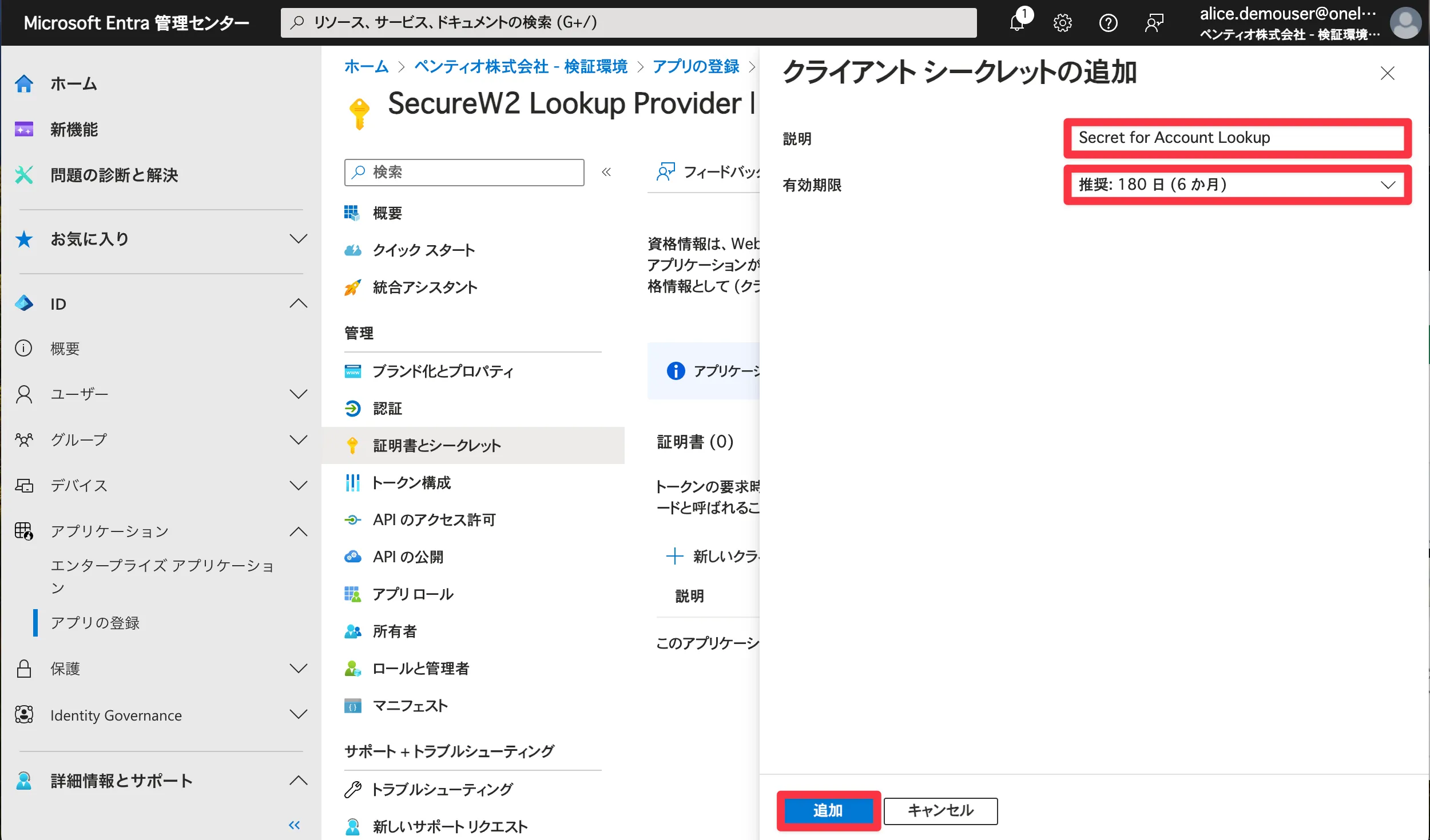 続いてシークレットを作成します。アプリケーションの画面から証明書とシークレット > 新しいクライアントシークレットをクリックします。