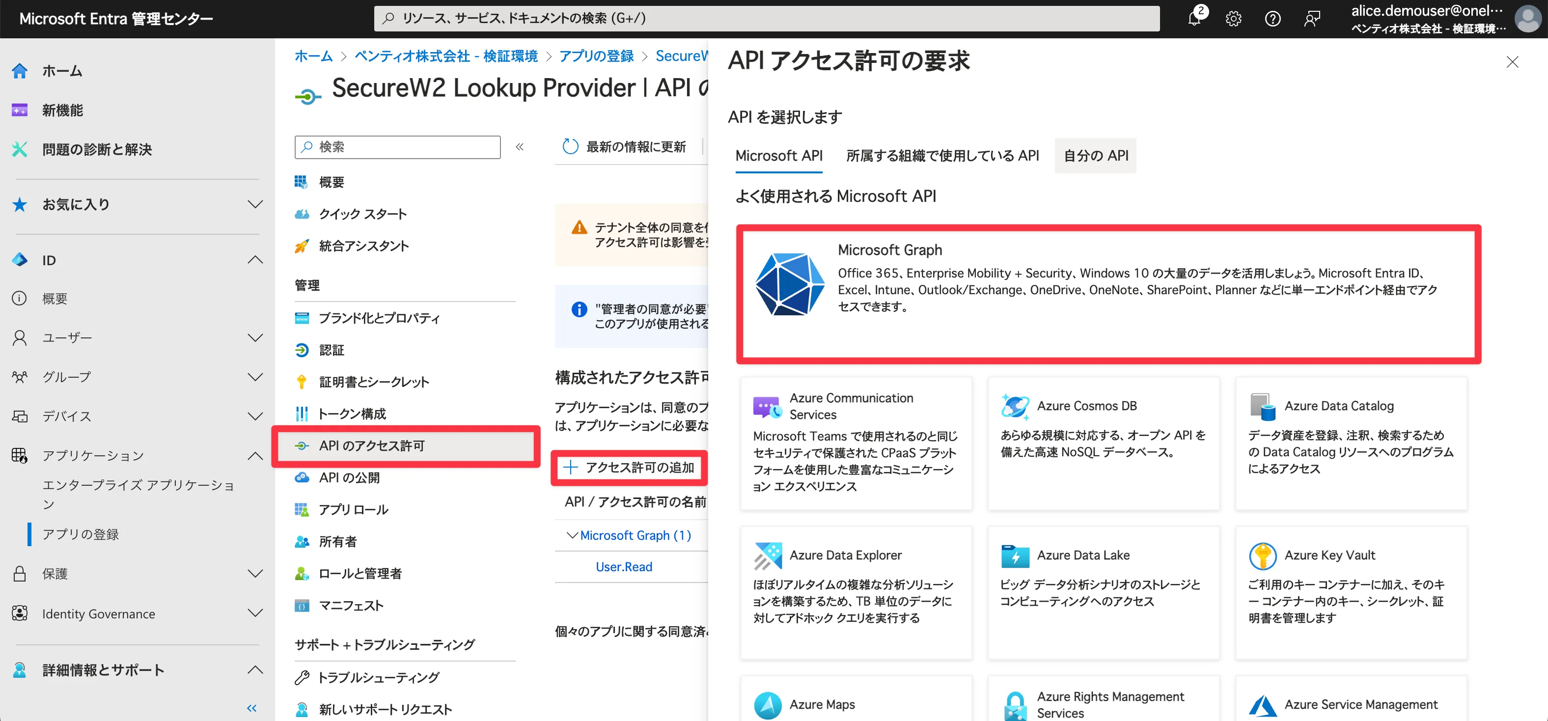 最後にAPIのアクセス権限の設定を行います。APIのアクセス許可 > アクセス許可の追加をクリックし、続けてMicrosoft Graphを選択します。