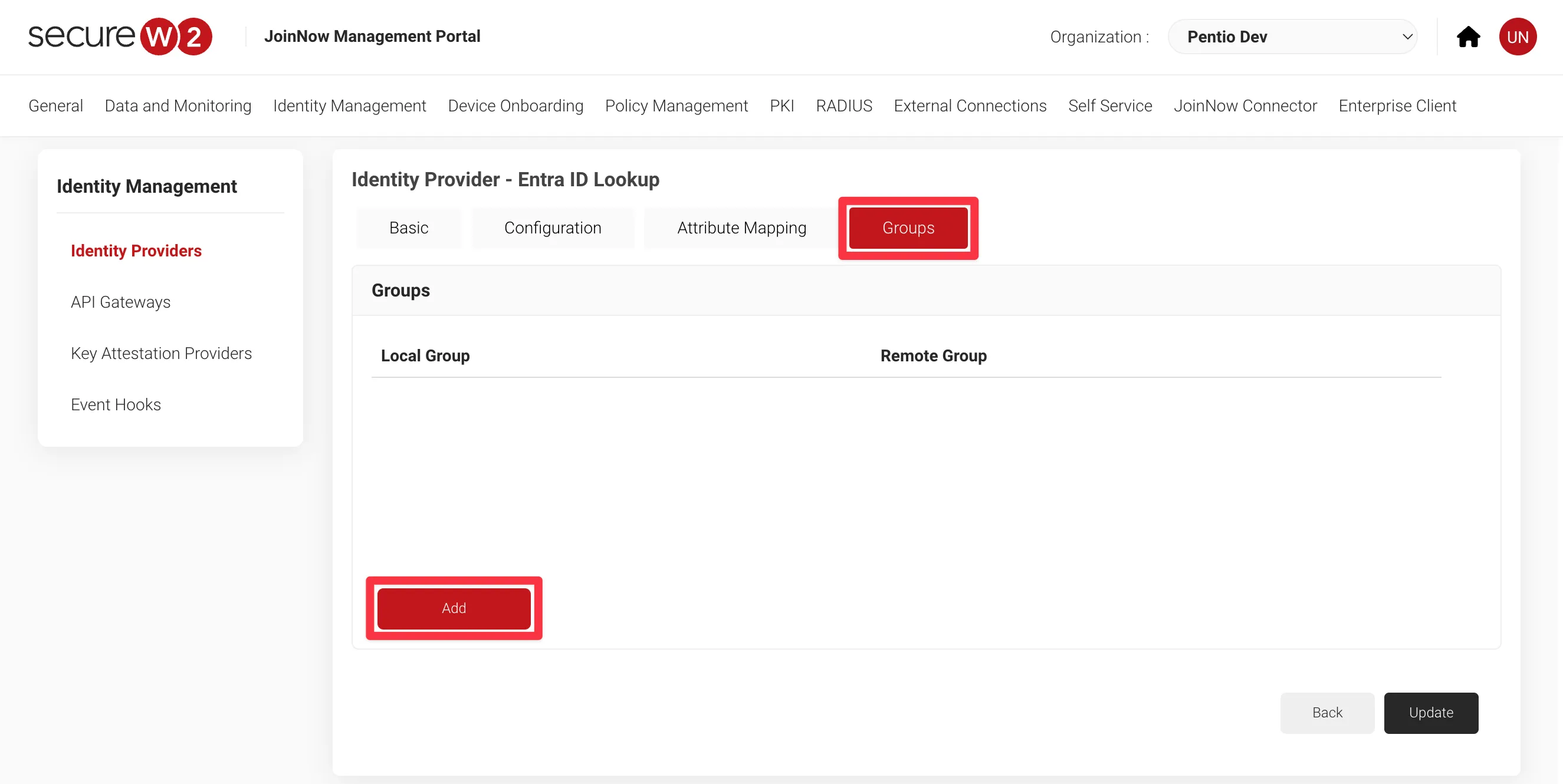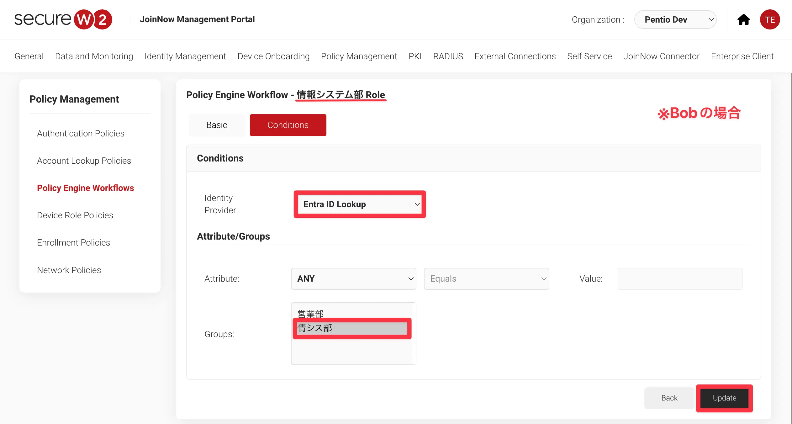 ID上の「営業部」グループに所属しているか「情報システム部」グループに所属しているかによってSecureW2のRoleを分けるため、それぞれに対応する「営業部