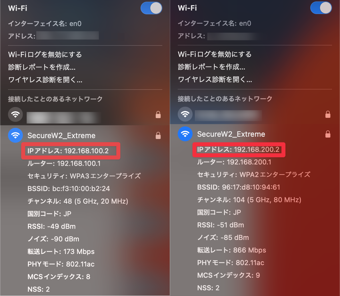 今回の例では、VLAN-IDが100の際にDHCPサーバーから192.168.100.2/24 - 192.168.100.254/24の範囲で、200の場合は192.168.200.2/24 - 192.168.200.254/24でIPアドレスを割り振る設定にしているため、設定した範囲のIPアドレスが正しく割り振られていることが確認できます。