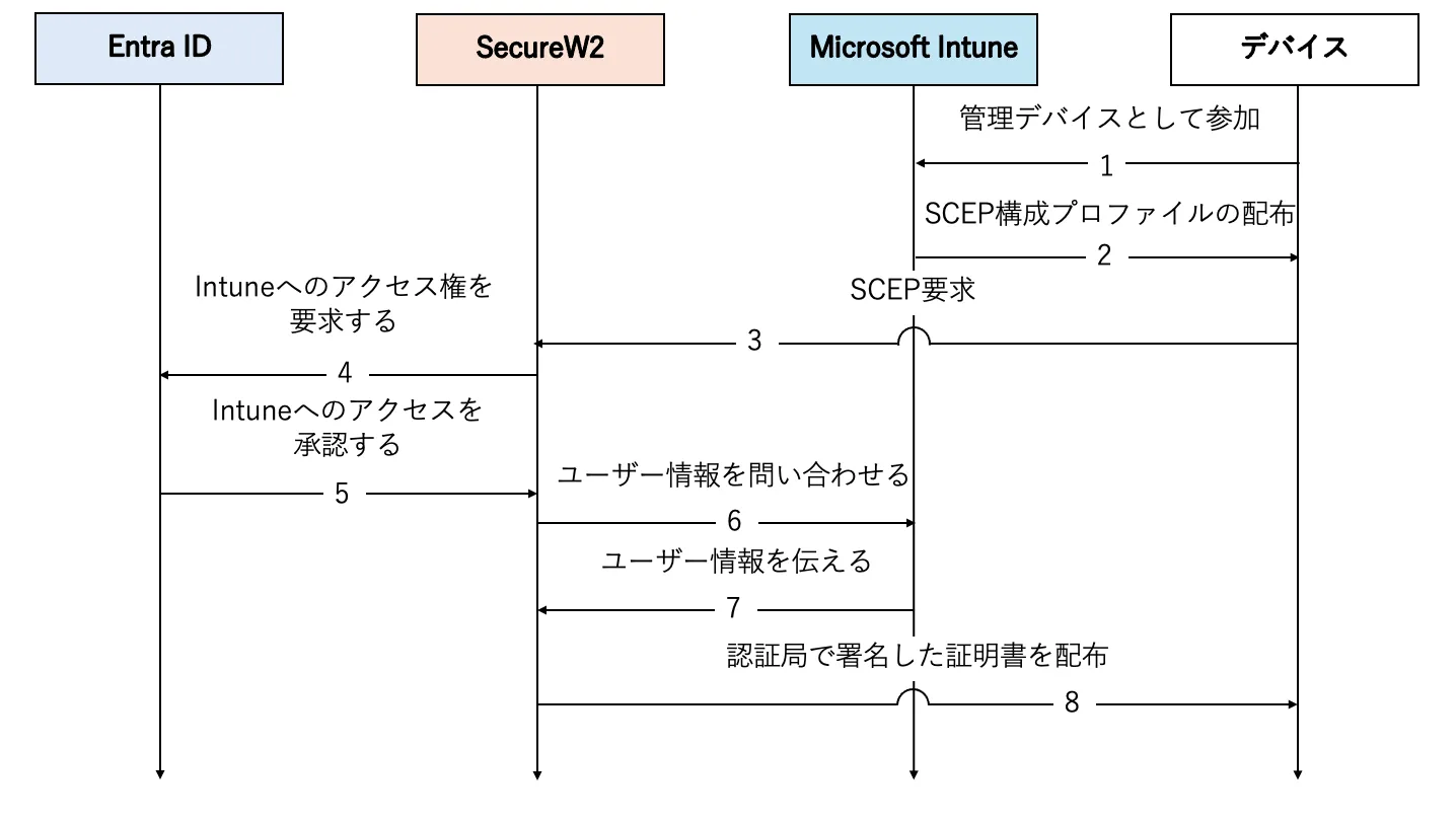 - デバイスがSecureW2に対して直接SCEP要求を行います