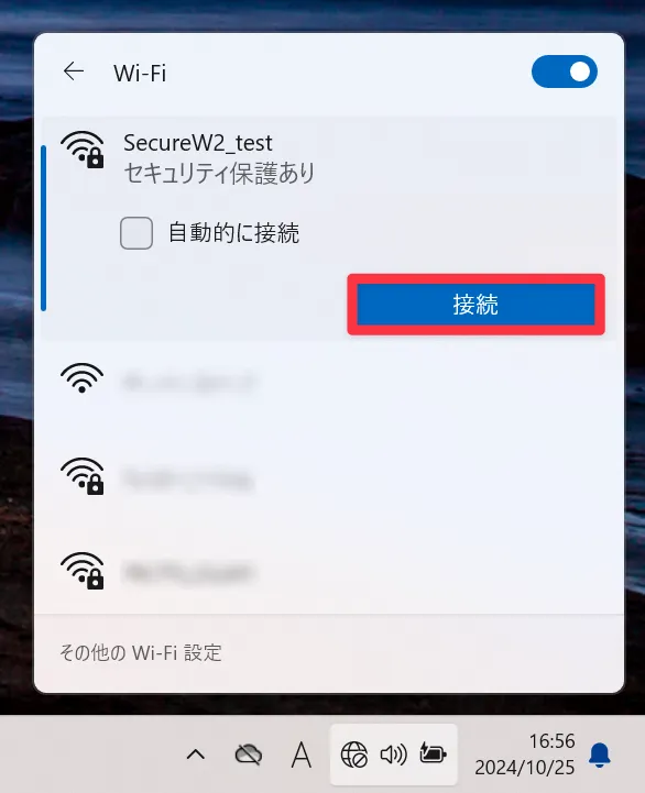 証明書を使って無線LANに接続できることを確認します。設定の画面から[ Wi-Fi ]を開き、配布されたWiFiプロファイルと同じ名前のSSIDをタップします。