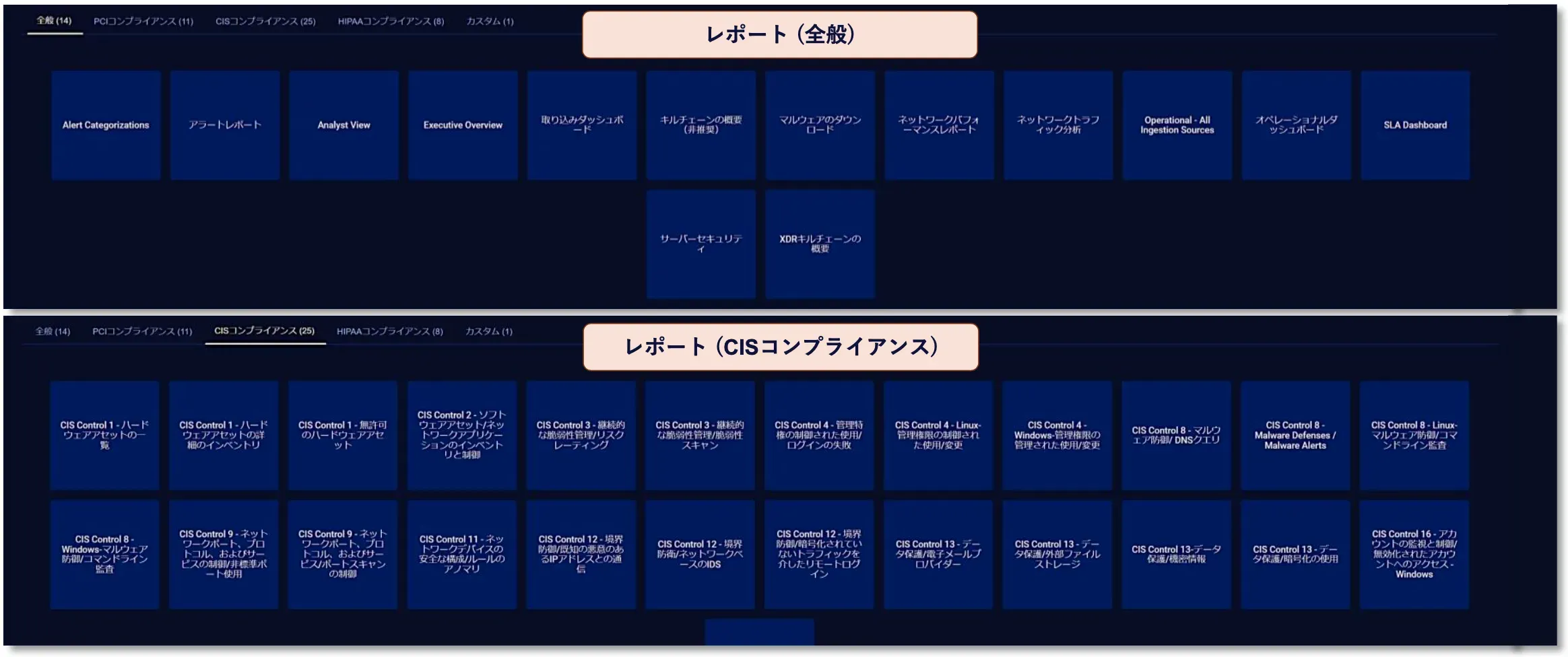 各コンプライアンスに準拠したレポートテンプレートを含め、カスタムレポートの作成やスケジュールレポート設定を行うことができます。