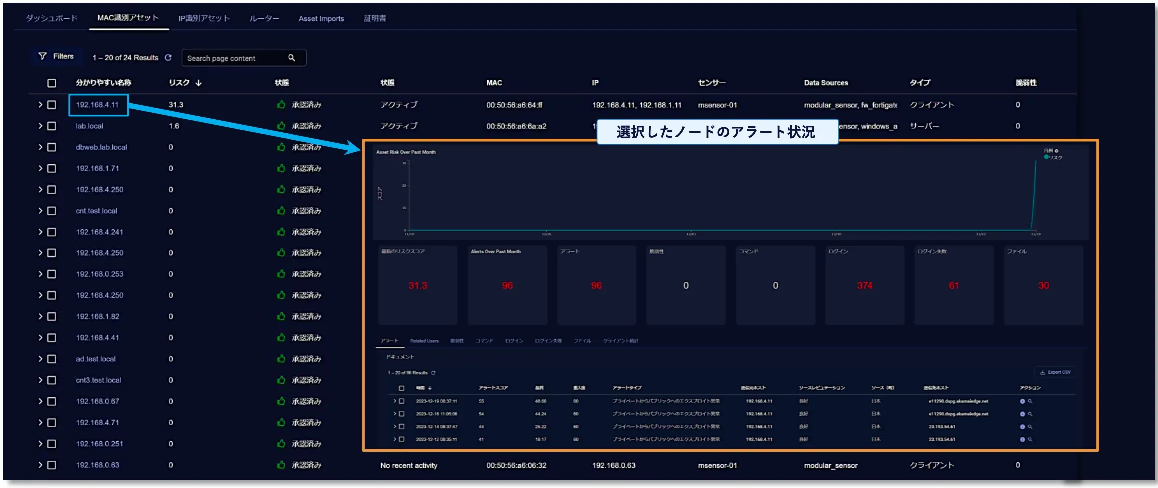 検出したノード単位でのリスクやその傾向を表示することができます。各ノード別に発生したアラートを表示することもできます。
