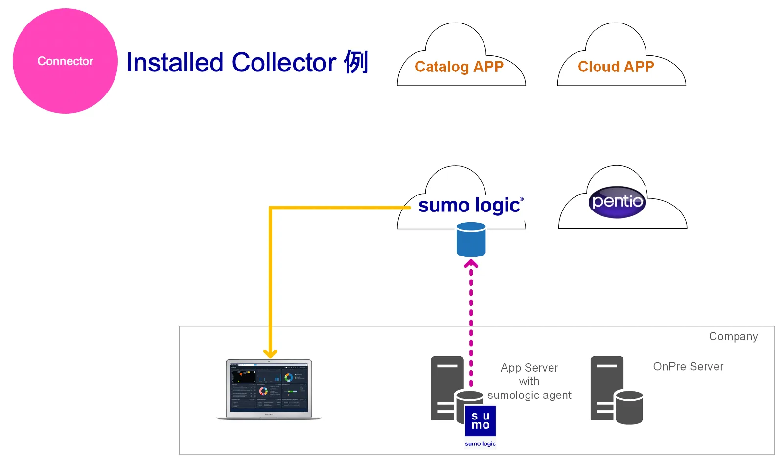 Installed Collectorは、サーバーやクライアントPCなどのローカル環境にエージェントをインストールし、データを暗号化、圧縮してSumo Logicへログを送信する方法です。社内でオンプレサービスを使用している場合や従業員が使用している端末からログを収集したい場合はこちらの方法でログを取り込みます。
