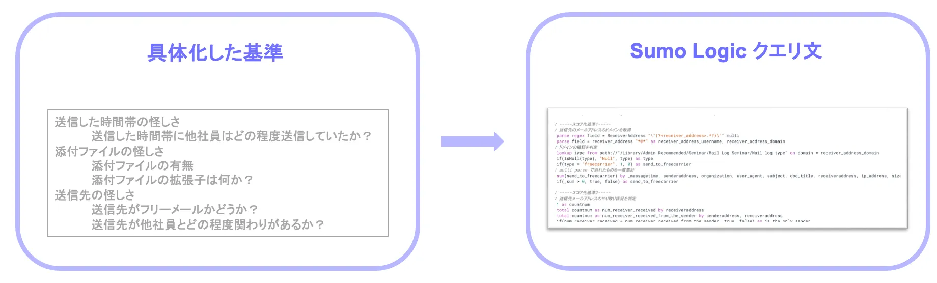 UEBAとは"User and Entity Behavior Analytics"の略で、日本語では「ユーザーとエンティティの行動分析」と表記されます。 機械学習を利用して社内ネットワーク上のユーザやその他のエンティティの通常の行動を学習し、異常行動を検知します。そして検知された行動がセキュリティ上に影響するかどうかを推定する、新しい分野のセキュリティソリューションです。 Sumo Logicが複数の業務アプリケーション利用をログデータからスコア化し、不正行為予兆を導き出すことでUEBAの行動監視の実現が可能となります。