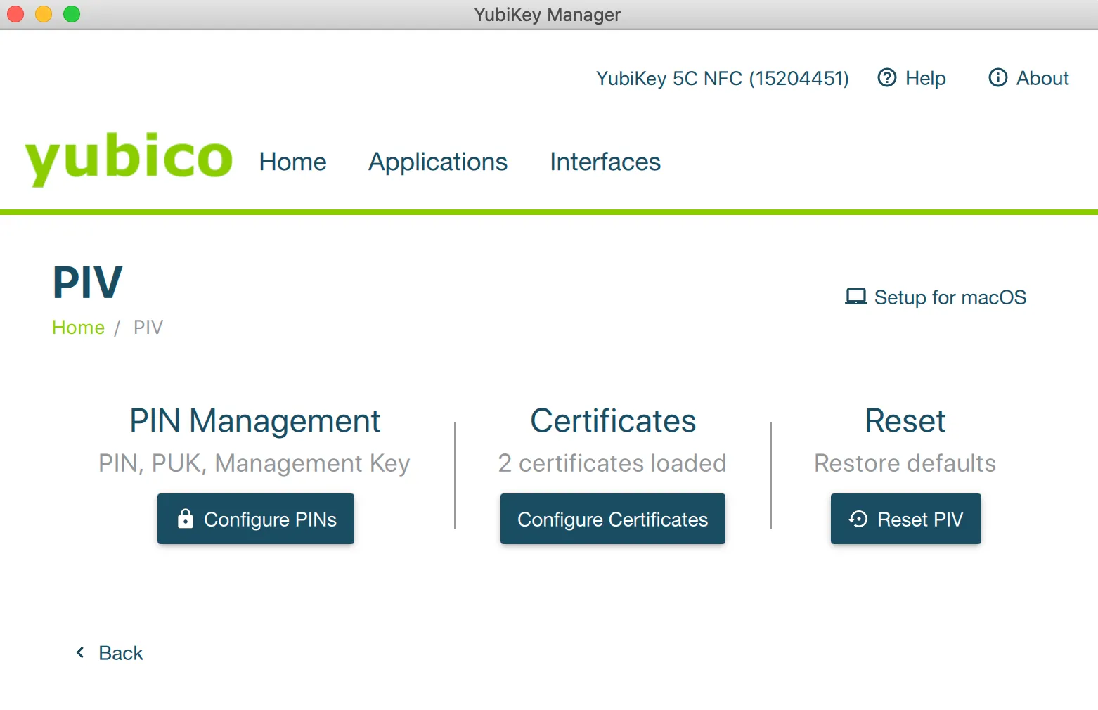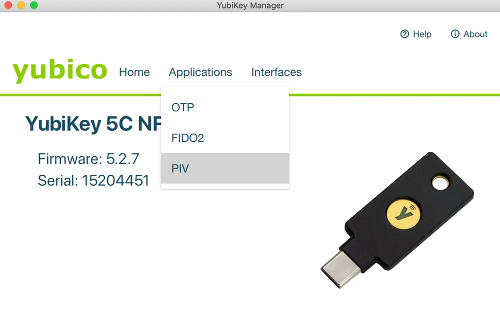 - YubiKey Managerを開き、Applications から [ PIV ]メニューをクリックして証明書発行へ移動