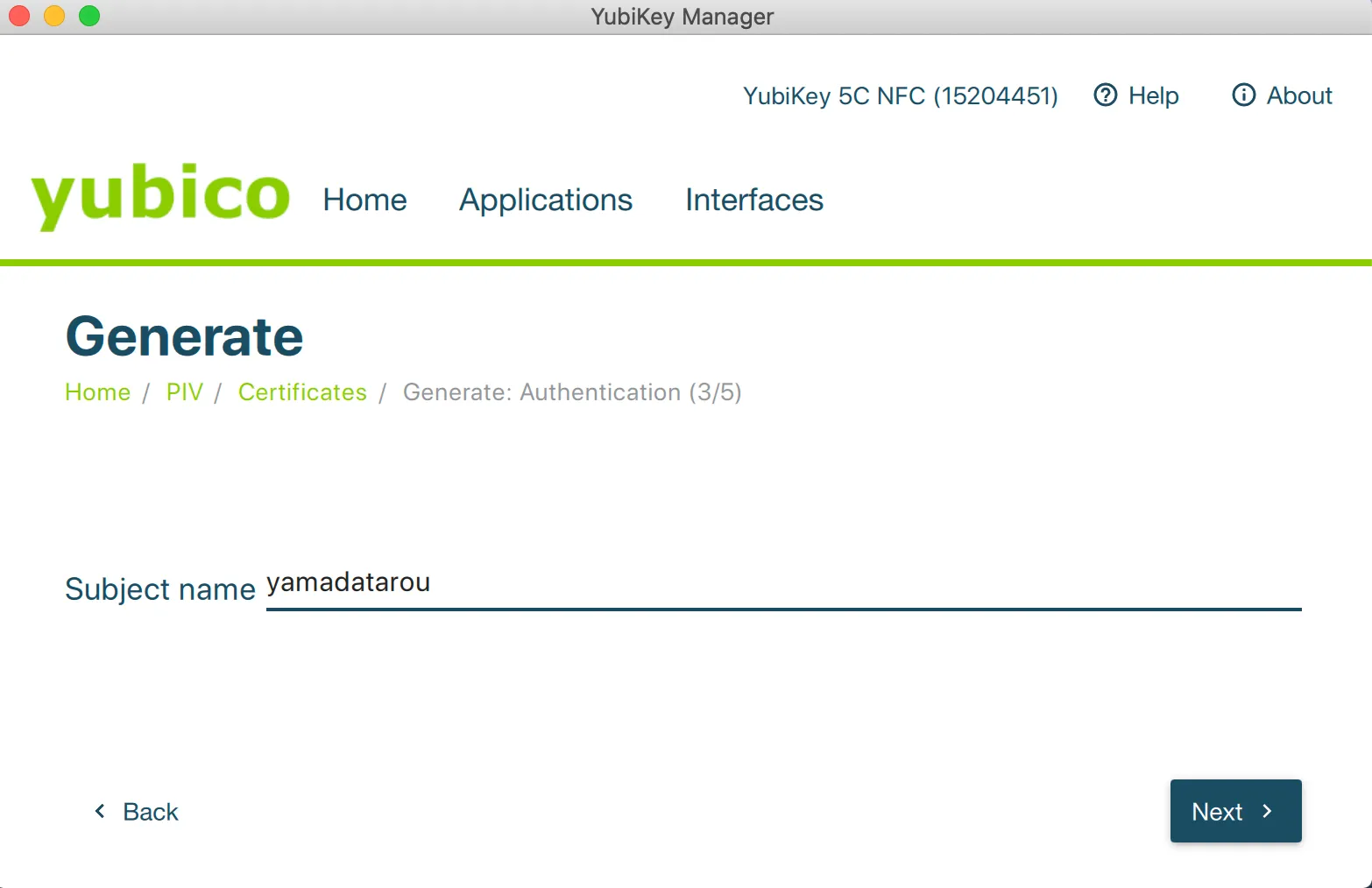 鍵の名前 Subject nameを入力して [ Next ] をクリック
