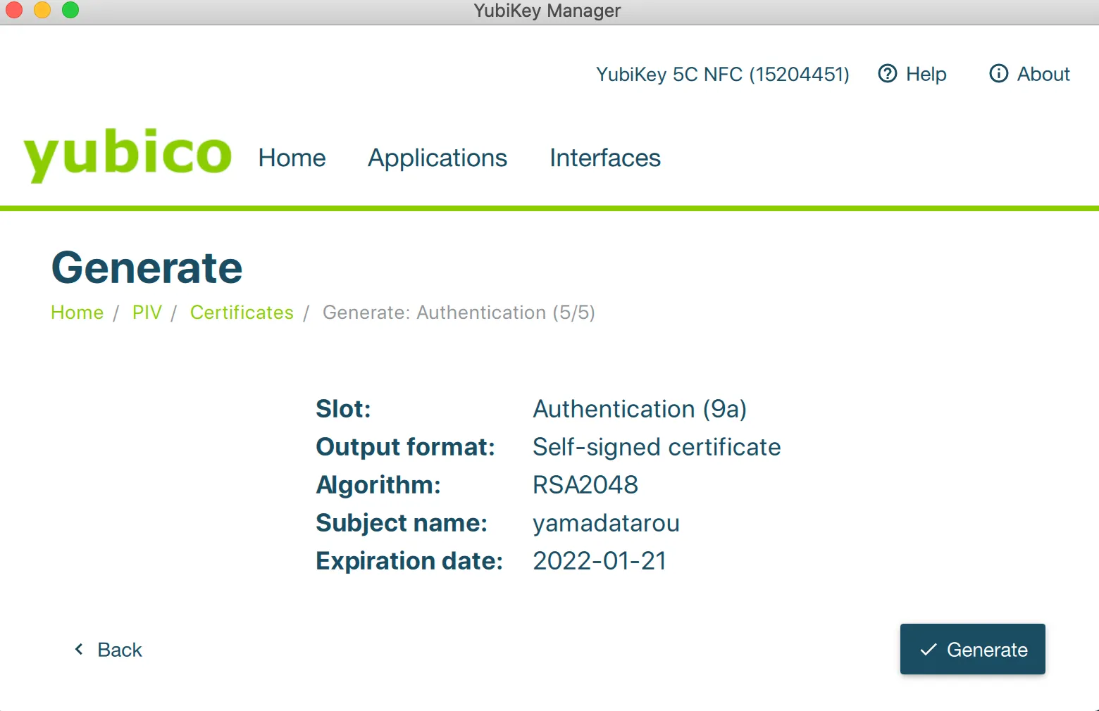 証明書を作成と格納するスロットのタブの右下の [ Generate ]