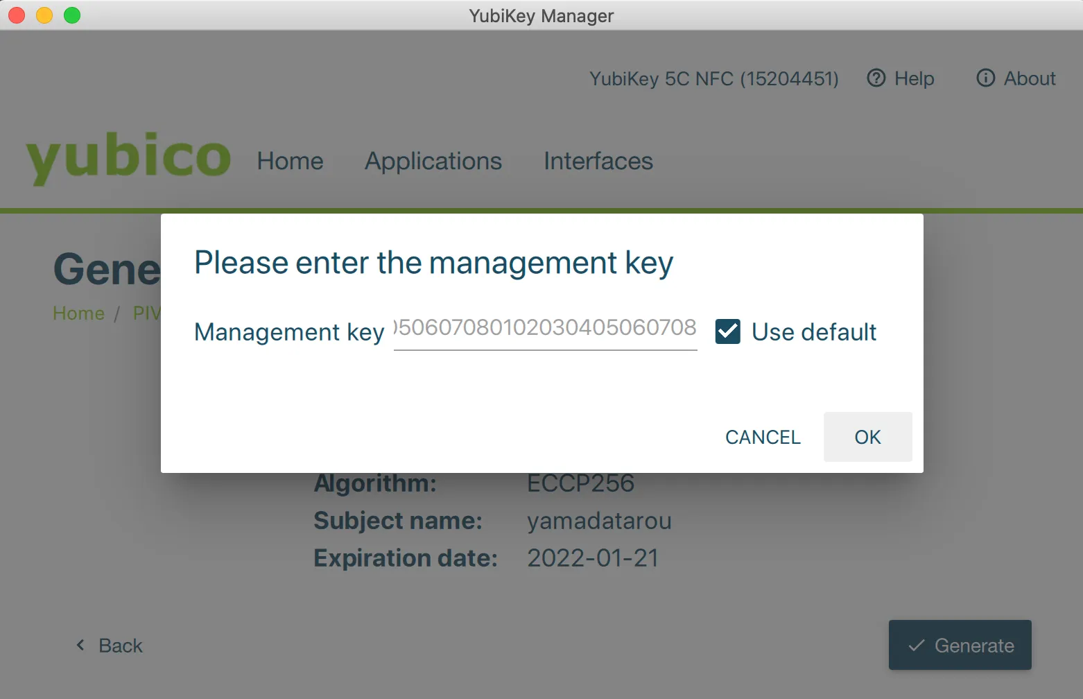 Keyを「010203040506070801020304050607080102030405060708」、PINを「123456」に設定していたときに、「スロット9a」に「yamadatarou」という名前の鍵ペアを生成)
